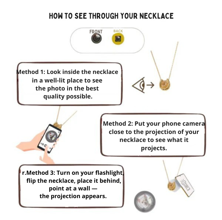Lleva tu foto favorita siempre contigo. Al mirar dentro del colgante o al proyectar luz sobre él, se revela una imagen en miniatura con un significado único.